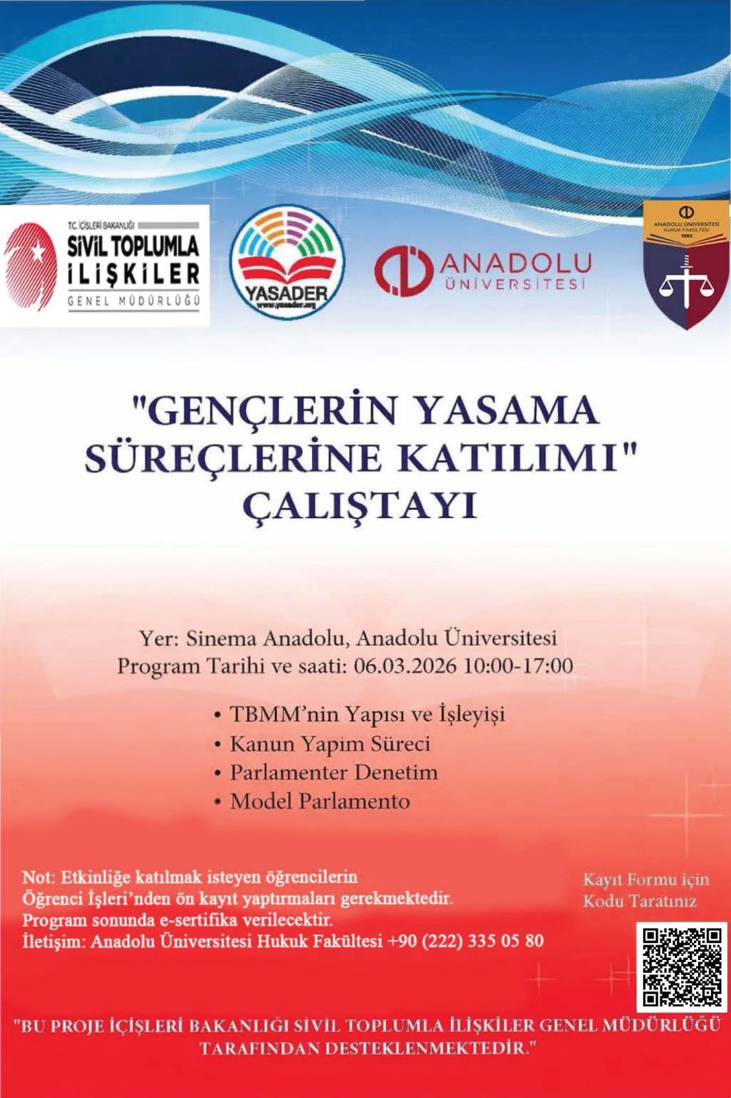 Bu kapsamda, Proje’nin ilk etkinliği Anadolu Üniversitesi Hukuk Fakültesi’nde 6 Mart 2026 tarihinde gerçekleştirilecektir. Etkinliğe katılmak isteyen öğrencilerin Üniversitenin Öğrenci İşlerinden ön kayıt kaptırmaları gerekmektedir.